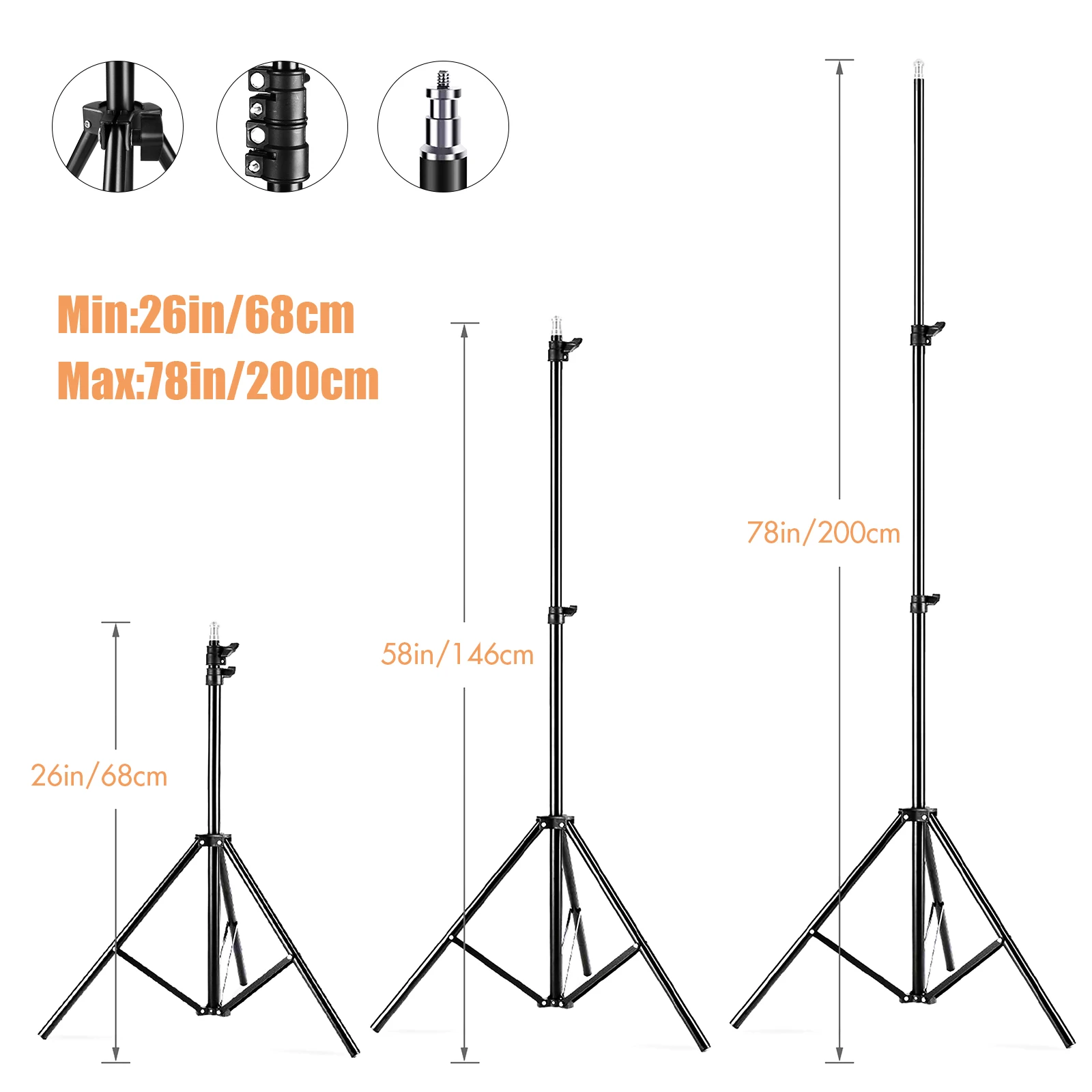 Pied d'éclairage réglable en métal : Fabriqué en alliage d'aluminium de qualité supérieure, il peut s'étendre de 68 à 200 cm. Sa conception stable à 3 pieds et son système de verrouillage robuste garantissent une utilisation sûre et fiable.